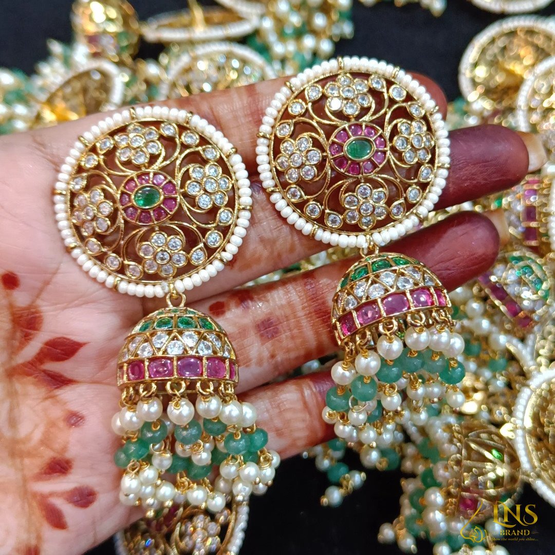 Stud highlighted with beads and jumka highlighted with pearls with backside pushers.